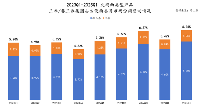 但随着火鸡面逐渐从消费者尝鲜的新兴品类转变为成熟品类,更多老牌方便面集团也都参与进来希望分一杯羹。基于马上赢品牌 CT 中的数据,火鸡面类型产品在方便面中的市场份额持续增长,其他集团的占比也在逐步增加。