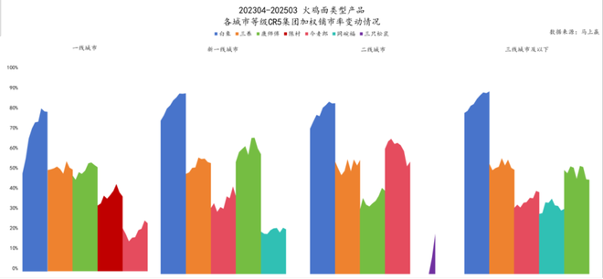 回溯 202304-202503 过去两年各城市等级中 CR5 集团的市场表现,白象、今麦郎在各城市等级中,均呈现着市场份额的增长,其中白象在一线城市的市场份额更是增长迅速。在 2025Q1 刚刚加入竞争的三只松鼠,也在二线城市等级市场中崭露头角,且涨势迅猛。
