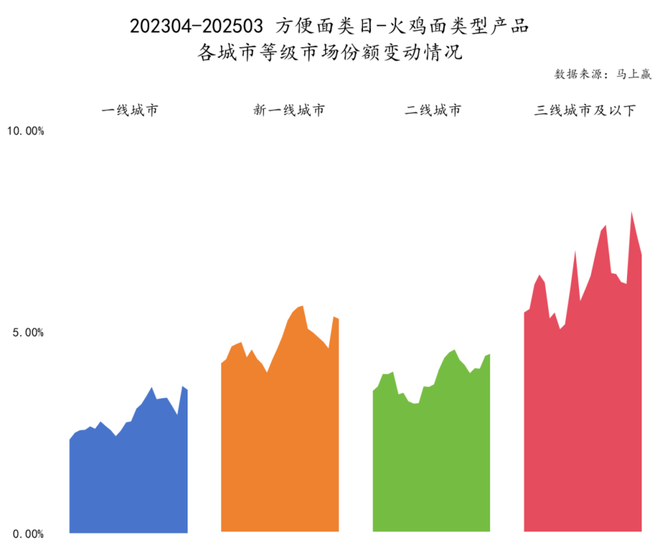 分城市等级从火鸡面在方便面类目中的占比来看,一方面,火鸡面在方便面中类目中的市场份额,在各城市等级中整体都呈现上升。另一方面,在各城市等级中,火鸡面在方便面中的占比的排序为三线城市及以下>新一线城市>二线城市>一线城市,产品类型的城市等级偏下特征相当显著。