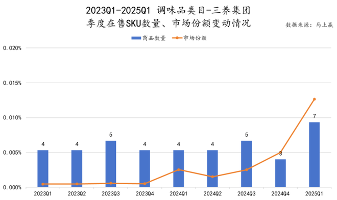 基于马上赢品牌 CT 中的数据,可以看到在调味品类目中,三养也已经有数款 SKU 持续在布局,且在 2024Q4,市场份额有较明显的提升。
