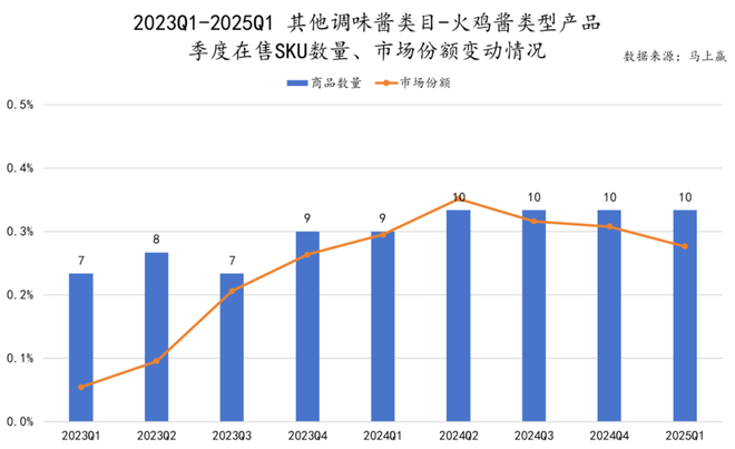 不过,即便是从方便面类目迁移到了调味品类目,三养的火鸡酱料也并非没有对手。从 2023Q1-2025Q1,可以看到,调味品-其他调味酱类目中,依然有着十款左右的火鸡酱类型产品,其中也包括三养的产品在内,在市场份额上整体也呈现着上升趋势。