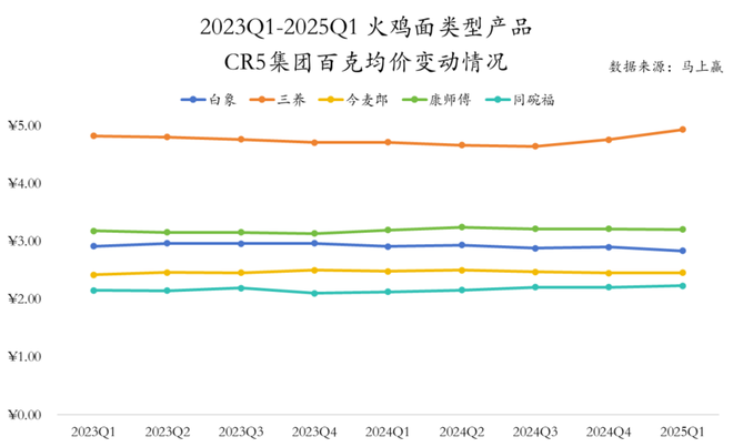 基于马上赢品牌 CT 中 2023Q1-2025Q1 的数据,几个本土集团如白象、今麦郎、康师傅等,其火鸡面产品的百克均价,相较火鸡面创始集团三养来说基本要低 50%左右。
