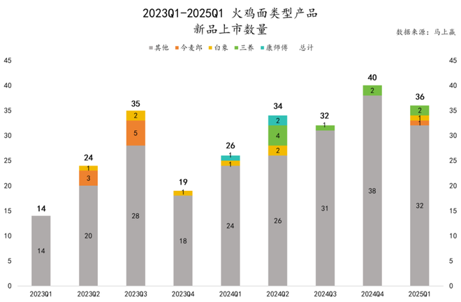 马上赢品牌 CT 中的数据显示,2023 年 4 月至今两年的时间里,方便面类目中,每个月都会有“火鸡面”产品上市,且上市新品数量呈现出一定的增长趋势。推出火鸡面新品的集团既包括传统的如康师傅、白象、今麦郎等方便面巨头,也包括各种新兴品牌。