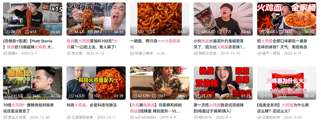 这种关于“辣”的挑战欲,使得以辣为核心的火鸡面成为了一个“挑战”里程碑,大量希望通过“整狠活”获取更多流量的各平台博主们,“前赴后继”地挑战火鸡面,将火鸡面与辣的绑定迅速具象化,并推送给成千上万的观众。