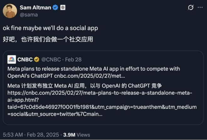 OpenAI虽未正式入局,但Sam Altman多次暗示“AI社交化”是必然趋势,他也在社交平台上提到,自己正在开发AI社交网络。
