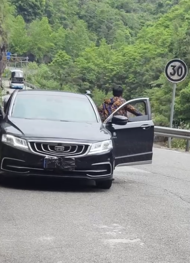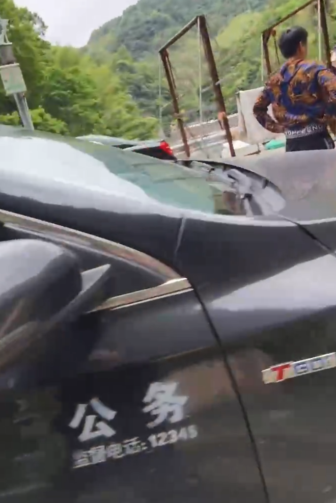 视频中,在一处山间公路处,一辆黑色吉利轿车停靠路旁,车牌处疑被黑色塑料袋遮挡。此时,主副驾驶的两人下车,车门打开时,可见车门处印有“公务”字样。视频拍摄者经过该车后,在车辆尾部,发现车尾的号牌也被遮挡。