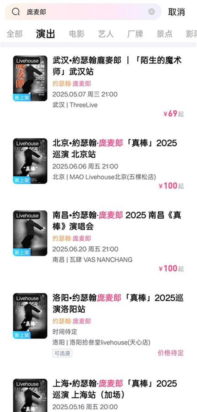 记者注意到,庞麦郎5月、6月的档期颇为紧张,5月5日台州站演出、5月7日武汉站演出、5月16日上海站演出、5月18日合肥站演出、5月24日北京站演出、6月6日北京站演出,6月14日常州站演出、6月20日南昌站演出、6月25日嘉兴站演出,以上巡回站每场69元至100元不等,都为Live House演出形式。