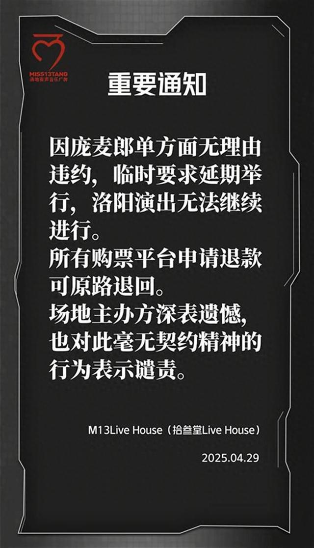 4月29日晚,洛阳拾叁堂Live House发布消息称,因庞麦郎单方面无理由违约,原定于30日举行的演出活动取消。随后,极目新闻记者联系主办方“拾叁堂Live House”,对方回应称,是临时取消的,会给购票者退票。