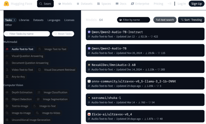 至今Qwen系列产品已在不少开源榜单中排名靠前。如据全球最大AI开源社区Huggingface 4月29日显示,在audio-text-to-text任务类目下,Qwen的两款模型热度居前。