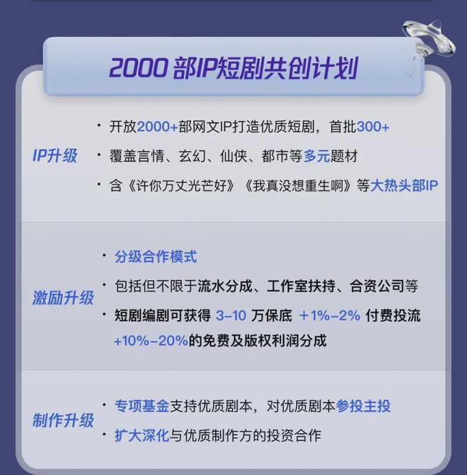 依托此前的“百剧计划”,百度短剧已经与生态内的七猫小说、爱奇艺等平台打通,实现资源共享。同时,百度生态外的阅文集团也是该计划的发起方之一,而阅文集团同样在短剧上持续加码,今年3月31日,阅文集团旗下短剧厂牌阅文短剧宣布启动战略升级,面向全行业开放超2000部网文IP。