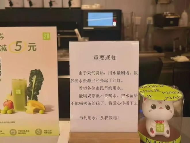 贴文中配发的《重要通知》的图片上印着:由于天气炎热,用水量剧增,很多淡水资源已经亮起了红灯,希望各位市民节约用水。能喝奶茶就不要喝水,把水留给不能喝的孩子,将爱心传播下去。节约用水,从我做起。