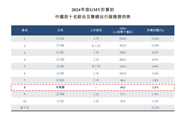 从整体来看,根据活力集团引用的数据,按照2024年的GMV计算,在我国的综合互联网出行服务提供商中,活力集团排在第八名,其所占的市场份额约为1.4%。