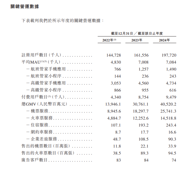 截至2024年年末,活力集团的付费用户数约为948万人,总GMV约为405.20亿元,其中机票服务GMV约为257.41亿元,火车票服务约为145.19亿元,住宿服务约为2.43亿元。