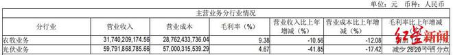 通威股份主营业务为农牧和光伏,其中,2024年光伏业务营收占比约为65%。年报显示,去年光伏业务营收为597.92亿元,同比下降41.85%,毛利率为4.67%,同比减少28.20个百分点。农牧业务营收为317.4亿元,同比下降10.56%,毛利率为9.38%,同比增加1.57个百分点。