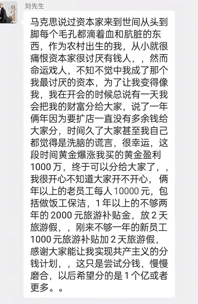 在此次分钱的群聊中,他发了一段长文说到,“马克思说过资本家来到世间,从头到脚每个毛孔都滴着血和肮脏的东西。作为农村出生的我,从小就很痛恨资本家很讨厌有钱人,然而命运戏人,不知不觉中我成了那个我最讨厌的资本。”
