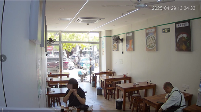 监控视频显示,4月29日13:13,这名打扮时尚的女子走进店内用餐,“来一碗小馄饨,10块钱的。”