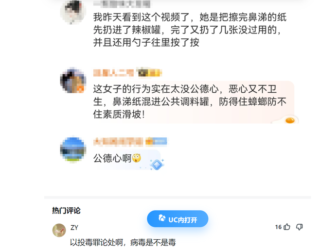 该馄饨店相关人员说,他们和该女子并不认识,事发当天该女子来店内点了一份馄饨,付了10元现金。店内工作人员一开始并没有发现该女子扔鼻涕纸的行为,等到收拾餐桌的时候发现辣椒罐里面有餐巾纸的情况,随后查监控才发现该女子的行为,“我们也是第一次遇到这种情况,而且用餐过程中也没有和她发生矛盾。”