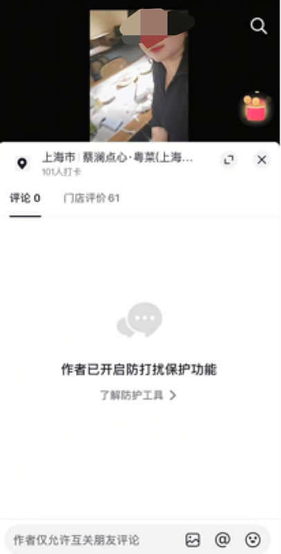 记者私信其抖音账号,发现其已设置隐私。记者尝试在视频评论区留言,其已开启防打扰保护功能,评论区评论显示为零。