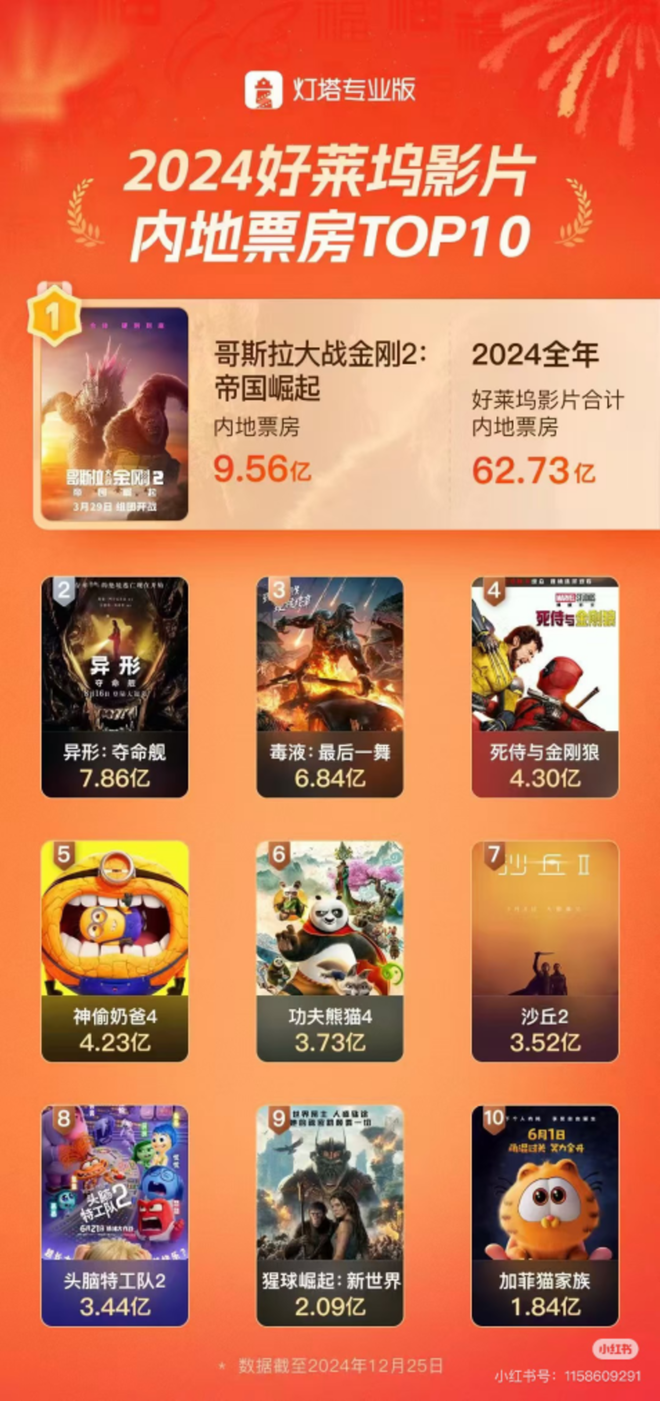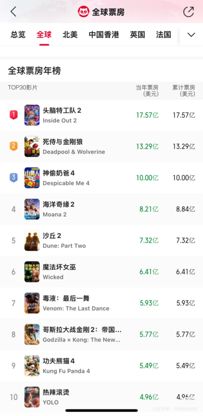 在全球范围内,好莱坞依旧取得了亮眼的表现。2024年度全球电影票房前十位中,好莱坞电影占9席,分别是《头脑特工队2》、《死侍与金刚狼》、《神偷奶爸4》、《海洋奇缘2》、《沙丘2》、《魔法坏女巫》、《毒液:最后之舞》、《哥斯拉大战金刚2:帝国崛起》、《功夫熊猫4》,这9部影片去年全部登陆了中国院线。