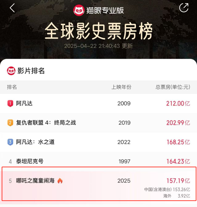 在这点上,好莱坞也许可以跟在中国市场吃到苦头的苹果公司取取经。而本土电影的多元化发展不仅带动国产电影起飞,更让中国电影走到国际市场,在全球排名中占有一席位置,这一现象从《哪吒2》以157亿票房登上全球票房榜第五已初见端倪。虽然中美贸易战仍在继续,中国电影人只要专注于自己的产业升级与精品化之路,这个巨大的百亿市场足够行业消化。