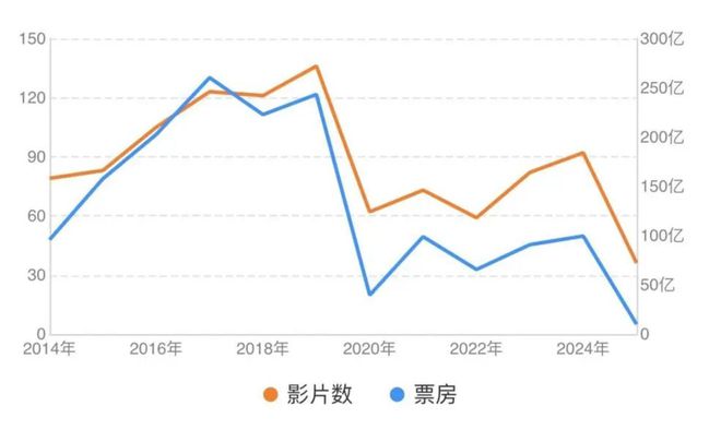 如此一来,每年国内引进美国大片的数量就尤为关键。从下图数据中不难看出,2023年、2024年,中国进口片数量、票房持续回暖,但一切都随着中美贸易战的不断升级戛然而止。在此背景下,2025年已经过去了4个多月,截至目前共引进了37部外部影片。