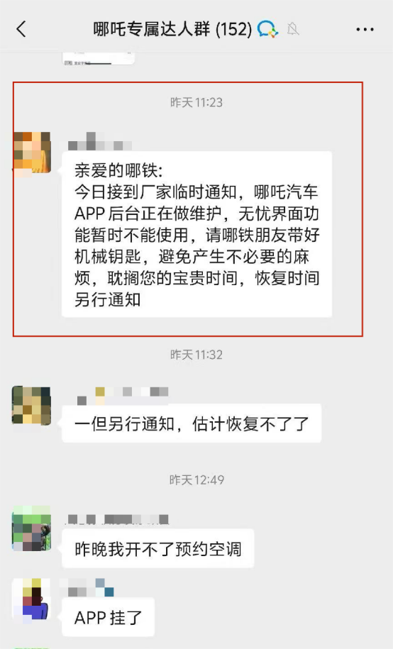 有车主称,其于5月3日在微信群里看到通知,哪吒汽车APP后台正在做维护,无忧界面功能暂时不能使用,恢复时间另行通知,并提醒车主带好机械钥匙。