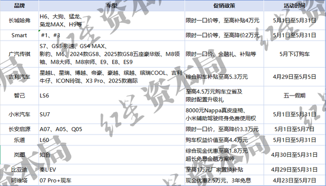 4月29日至2025年5月31日,比亚迪(002594.SZ)秦L EV推出限时置换补贴政策,至高可享1万元厂家加码补贴。