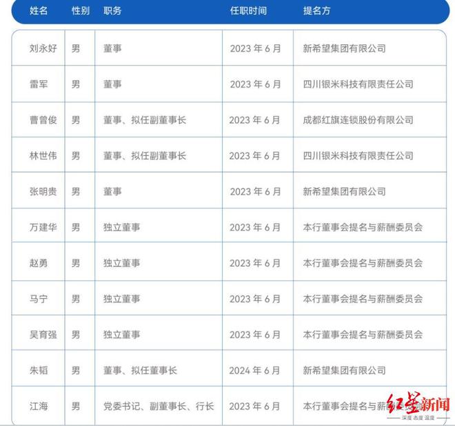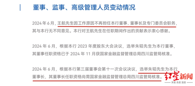 同时,该行已选举朱韬为新任董事长,其董事长任职资格尚需国家金融监督管理总局四川监管局核准。
