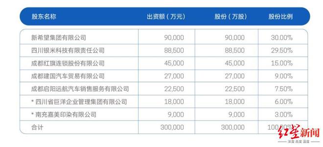 截至2024年末,新希望集团有限公司持股30%,是其最大股东;第二大股东为北京小米电子软件技术有限公司旗下的四川银米科技有限公司,持股比例为29.5%;第三大股东为成都红旗连锁股份有限公司,持股比例为15%;此外,成都建国汽车贸易有限公司、成都启阳远航汽车销售服务有限公司、四川省巨洋企业管理集团有限公司、南充嘉美印染有限公司分别持有9%、7.5%、6%、3%股权。
