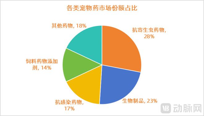 但与欧美国家相比,中国宠物饲养家庭比例仍较低,这意味着该市场还具有巨大的潜力,随之也促进了宠物医疗行业的飞速发展。宠物药是指专门用于预防、治疗、诊断宠物疾病,保证宠物身心健康,以及用于防止宠物疾病传染给人,保障饲养者健康和安全的药物。宠物药根据产品的类别划分,包含抗寄生虫药物、生物制品、抗感染药物、饲料药物添加剂和其他药物,按剂型分主要有片剂、擦剂、喷剂、滴剂、软膏剂、注射剂和疫苗等。其中,市场份额最大的是抗寄生虫药物,占据了28%市场份额,全球市场总额高达31.15亿美元。