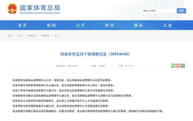 近日,国家体育总局网站发布干部调整信息。其中,任命黄玮为游泳运动管理中心主任、党委书记,免去其游泳运动管理中心纪委书记职务。