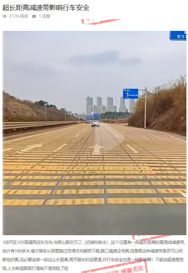赣州市民反映当地另一处超长减速带存在安全隐患。 据“赣州发布”截图