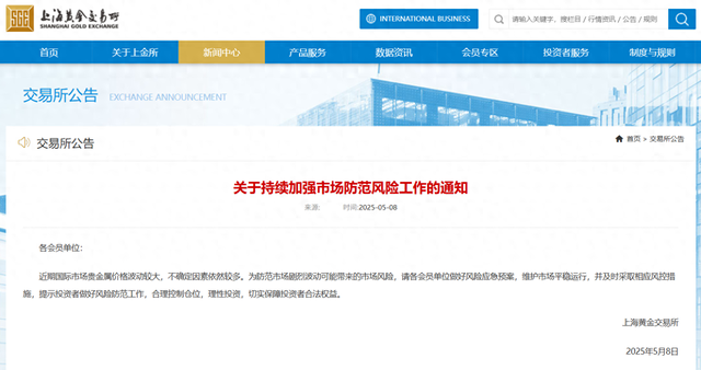 5月8日,上金所发布关于持续加强市场防范风险工作的通知:近期国际市场贵金属价格波动较大,不确定因素依然较多。为防范市场剧烈波动可能带来的市场风险,请各会员单位做好风险应急预案,维护市场平稳运行,并及时采取相应风控措施,提示投资者做好风险防范工作,合理控制仓位,理性投资,切实保障投资者合法权益。(上金所网站)