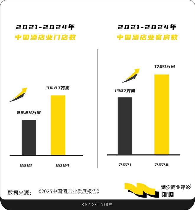 据中国饭店协会《2025中国酒店业发展报告》显示,2021年中国酒店业共有25.24万家门店,客房数为1347万间。而到了2024年,中国酒店业门店数增长至34.87万家,客房数达到1764万间,3年增长近10万家。