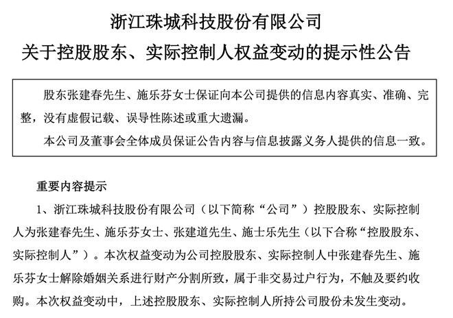 红星资本局5月9日消息,昨日晚间,珠城科技(301280.SZ)发布公告称,公司近日收到控股股东、实际控制人中张建春和施乐芬的通知,经双方协商一致,已解除婚姻关系,并就离婚财产分割事宜作出相关安排。