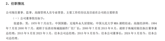 珠城科技2024年年报显示,张建春与张建道系兄弟关系;施乐芬系张建春之配偶,施士乐之妹妹。年报还显示,张建春出生于1970年7月,1994年7月至2000年7月,就职于乐清市珠城接插件厂任厂长;2000年7月至2015年8月,就职于珠城有限任执行董事兼总经理;2015年9月至2023年3月,任珠城科技总经理;2015年9月至今,任珠城科技董事长;2024年5月至今,任珠城科技总经理。