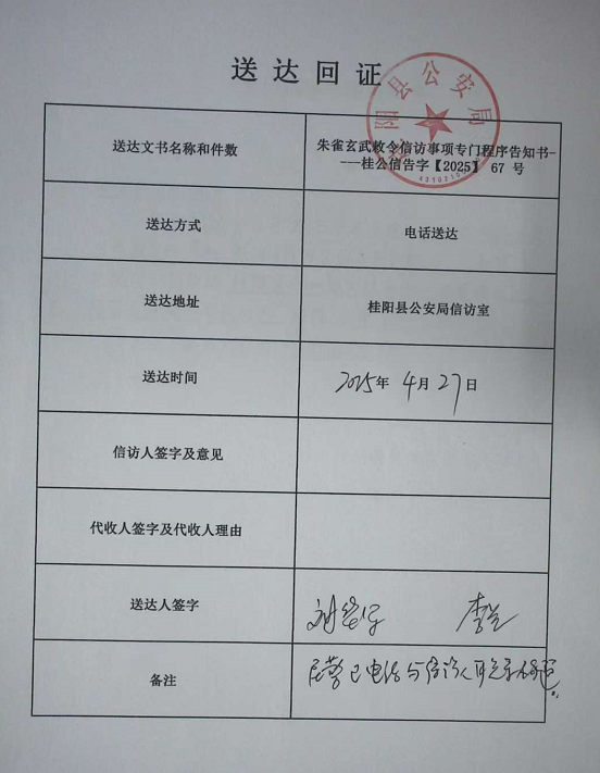 此外,一份盖有桂阳县公安局公章的送达回证显示,上面有送达人的签字,备注栏标明民警已电话与信访人联系。