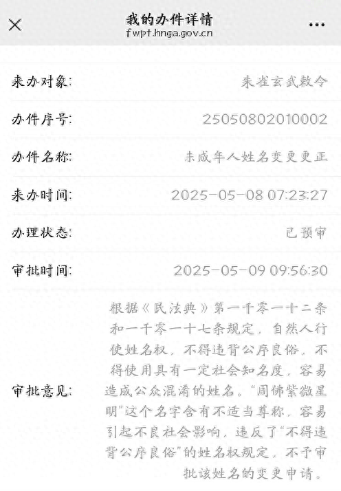 “这是我们湖南公安服务平台。”小朱提供了系统截图,记者看到,系统审批时间是5月9日上午,审批意见栏显示,根据《民法典》相关规定,自然人行使姓名权,不得违背公序良俗,不得使用具有一定社会知名度,容易造成公众混淆的行为。