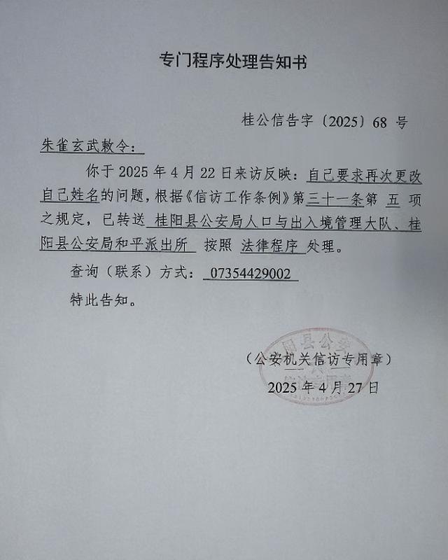 此前,一份盖有桂阳县公安局信访专用章的《专门程序处理告知书》显示,“朱雀玄武敕令”自己要求再次更改姓名,根据《信访工作条例》相关规定,已转送桂阳县公安局人口与出入境管理大队、桂阳县公安局和平派出所按照法律程序处理。