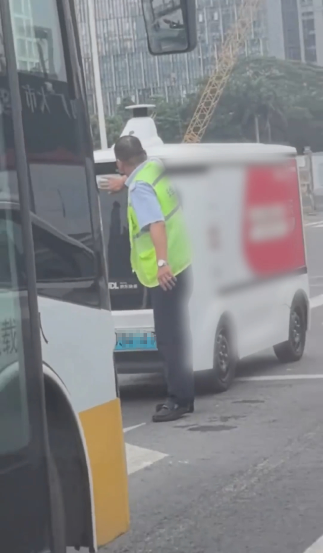 5月9日,广东深圳龙岗区一处大型十字路口,一辆无人驾驶快递车左转过十字路口时疑似走错路,与一辆在十字路口左转道等红灯的公交车“顶牛”,司机下车查看无奈摇头的视频引发关注。