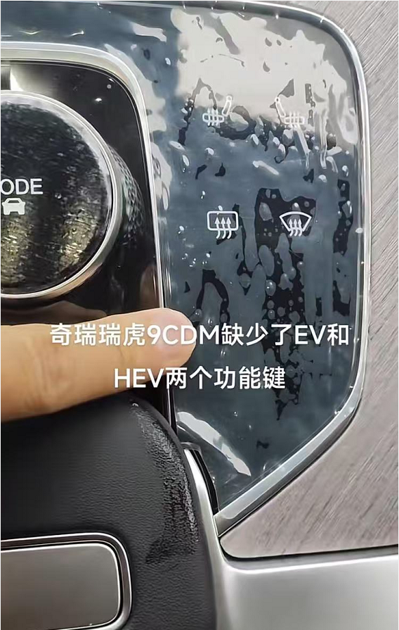 记者注意到,一位奇瑞新晋车主4月30日、5月2日、5月7日在抖音账号发布视频,称其购买的奇瑞9CDM插电混动版新车,驾驶室面板保护膜都未拆封,但是缺少标配EV和HEV两个切换功能按键。