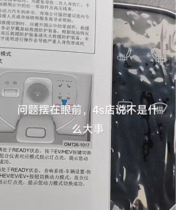 日前,贵州一车主反映新提的奇瑞9CDM插电混动版,车面板保护膜都未拆封,但是缺少标配EV(纯电动模式)和HEV(混合动力模式)两个切换功能按键。与4S店交涉,对方提议可以更换面板解决问题。