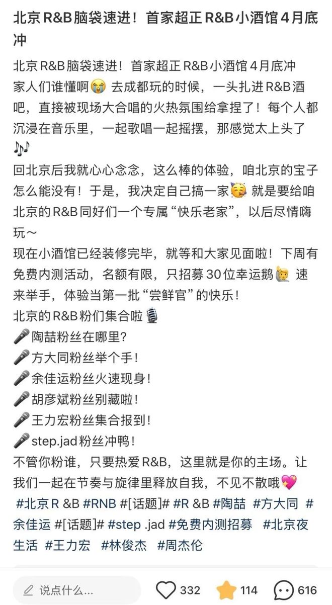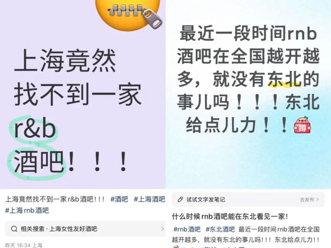 从3月到现在,仅两个月,就有北京、青岛、芜湖、西安、石家庄、杭州、烟台、重庆、郑州、昆明等十多个城市陆续开起了R&B bar,其中很多家都会在推进前在小红书发征询贴确定本地的市场需求。在小红书#RNB酒吧 话题下有1000+讨论,许多网友在社交媒体发问,自己的城市什么时候有这样的酒吧——看起来,至少在一二线城市,一家R&B酒吧有机会成为一种城市标配。