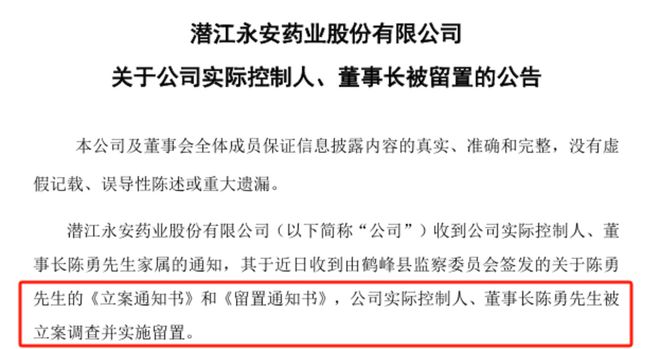 2025年5月5日晚,永安药业一纸公告震动资本市场:公司实控人、董事长陈勇被湖北省鹤峰县监察委员会立案调查并实施留置。永安药业未在公告中披露陈勇被留置的原因,后续其证券部向媒体表示,事情的进展包括结论,目前尚未接到相关通知。