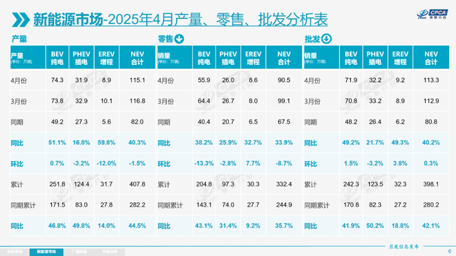 4月新能源乘用车市场零售90.5万辆,同比增长33.9%,环比下降8.7%;1-4月累计零售332.4万辆,同比增长35.7%。4月新能源乘用车厂商出口18.9万辆,同比增长44.2%,环比增长31.6%;1-4月累计出口59万辆,同比增长26.7%。