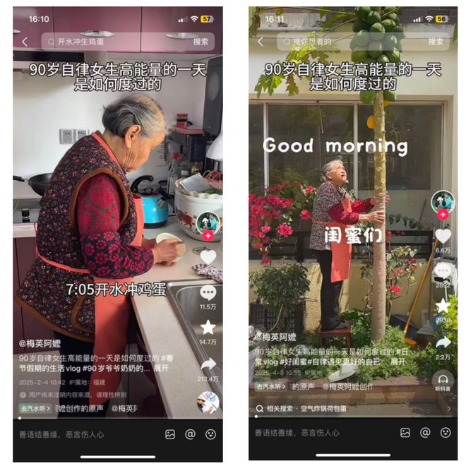 “秀日常”的生活记录,主要记录的是“高能量”版自律生活,简单来说就是以1.5-2倍速展示中老年人高效的一天,以@周大爷不服老和@梅英阿嬷为代表。