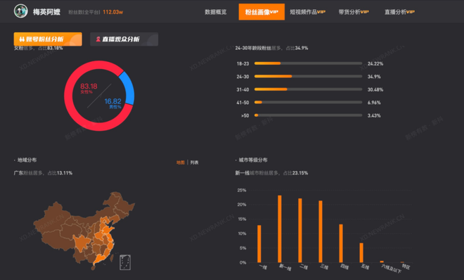 从新榜的数据来看,@梅英阿嬷以24-30岁的年轻人为主(34.9%),其次是31-30岁(30.48%)和18-23岁(24.22%);女性粉丝居多,城市分布多在新一线城市、二线城市、三线城市。