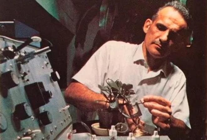 ▷巴克斯特和他的盆栽。他认为植物会感到疼痛并具有超感官知觉。图源:EXO-Science