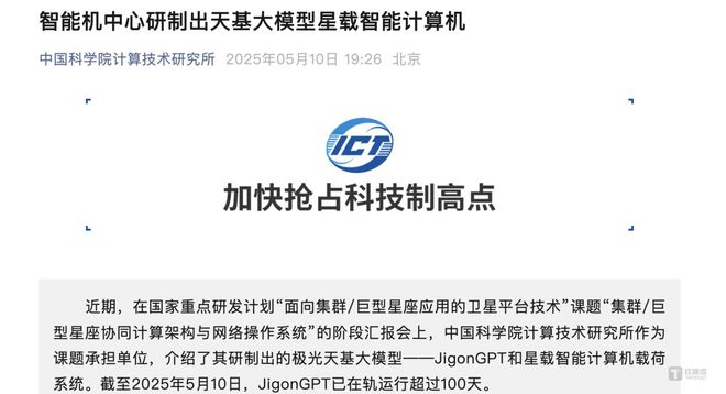 5月12日消息,钛媒体AGI获悉,中国科学院计算技术研究所(以下简称“计算所”)近期披露,该所智能计算机中心团队联合北京智源人工智能研究院、武汉大学研制出2.3亿参数规模的极光天基大模型JigonGPT,安装星载智能计算机载荷系统当中,并于今年2月发射的“东方慧眼高分01星”上实现入轨,至今已在轨运行超过140天。