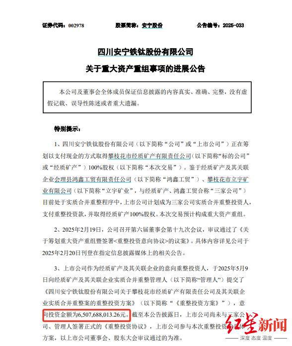 5月11日晚,安宁股份公告称,鉴于经质矿产及其关联企业会理县鸿鑫工贸有限责任公司(下称“鸿鑫工贸”)、攀枝花市立宇矿业有限公司(下称“立宇矿业”)目前处于实质合并重整程序中,安宁股份计划成为三家公司(经质矿产、鸿鑫工贸、立宇矿业)实质合并重整投资人,并于5月9日提交了相关《重整投资方案》,意向投资金额为65.08亿元,该款项将分别用于偿还三家公司债务及支付股权价值款。